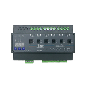 输出负载:(1)6回路大功率继电器开关,20A/路,用于控制调光电源火线的通断。 (2)6回路0-10V模拟信号输出,每回路电流20mA,用于控制调光亮度。